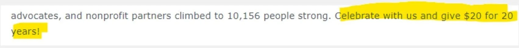 This organization capitalizes on its anniversary year for a meaningful call to action, tying an attainable $20 gift into a movement.