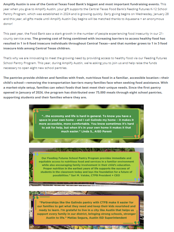 The Central Texas Food Bank is typically one of the highest fund earners during the annual Amplify Austin campaign, and they follow a specific structure.